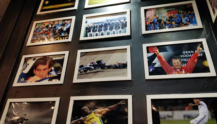 ക്രിക്കറ്റ് ചരിത്രത്തിലെ ഏറ്റവും വലിയ ത്രില്ലറുകളില് ഒന്നായ ഇംഗ്ലണ്ടിലെ നാസ്റ്റ് വെസ്റ്റ് ഫൈനലില് മാറിടം കാണിച്ച് അലറിയ സൗരവ് ഗാംഗുലിയുടെ ചിത്രവും ഇവിടെ കാണാം. മറ്റൊന്നു ഫുട്ബോളിലാണ്. ഫ്രഞ്ച്താരം സിനദിന് സിദാന് ഇറ്റലിയുടെ മറ്റരാസിയെ തലകൊണ്ടിടിച്ചു വീഴ്ത്തുന്ന പടമാണ്. 2006 ലോകകപ്പില് ഫ്രാന്സും ഇറ്റലിയുമായി നടന്ന ഫൈനലിലായിരുന്നു ഇത്. മറ്റരാസി സിദാനോടു മോശമായി പെരുമാറിയതിനാണ് സിദാന് ആക്രമിച്ചത്. ഫുട്ബോളിനു പേരുദോഷമുണ്ടാക്കിയ സംഭവമായിതുമാറി. ഇങ്ങനെ ഓരോ ചിത്രവും ഓരോ കഥ പറയുന്നു. ചിത്രങ്ങള്ക്കിടയില് സച്ചിന്റെ ചെറുപ്രായവുമുണ്ട്. അസ്റുദീന്റെ കൂടെ ഇറങ്ങിവരുന്ന സച്ചിന്റെ കുട്ടിക്കാലം ആരും നോക്കിനിന്നു പോകും. ടെന്നീസിലെ പ്രസിദ്ധ കളിക്കാരായ ബോറിസ് ബെക്കര്, പീറ്റ്സാംപ്രസ്, ക്രിക്കറ്റില് ലോകകപ്പ് നേടിയ ഇന്ത്യന് ടീം, ബോക്സിംഗ് താരം മുഹമ്മദലി എന്നിവരുടെ ചിത്രവും ആവേശം പകരും. ഇതിനോടൊപ്പം ഡേവിഡ് ബെക്കാമിന്റെ ഫ്രീകിക്കുകളുടെ ചാരുതയും തെളിഞ്ഞുകാണാം. ഇവയ്ക്കിടയില് മലപ്പുറത്തിന്റെ ഫുട്ബോള് ചിത്രവുമുണ്ട്. 1950 കളില് മലപ്പുറത്തു നിറഞ്ഞുനിന്ന മൊയ്തീന് റബര് എസ്റ്റേറ്റ് ഫുട്ബോള് ക്ലബി (എംആര്ഇ)ന്റെ ബ്ലാക്ക് ആന്ഡ് വൈറ്റ് ചിത്രം കാണുമ്പോള് ഓര്മകള് ഒരുപാട് പിറകോട്ടു പോകും. മാമ്മന്മാപ്പിള ട്രോഫി, ചാക്കോളാസ് ട്രോഫി എന്നി ടൂര്ണമെന്റില് പങ്കെടുത്ത ടീമായിരുന്നു എംആര്ഇ. ഇങ്ങനെ ഒരുപാട് ചിത്രങ്ങളാണ് റസ്റ്റോറന്റില് പതിച്ചിരിക്കുന്നത്. പവലിയന് റസ്റ്റോറന്റിന്റെ ഉടമസ്ഥനായ മലപ്പുറം കിളിയമണ്ണില് അജ്മലിന്റെ സ്പോര്ട്സ് കമ്പമാണ് ചിത്രങ്ങള് സ്ഥാപിച്ചതിനു പിന്നില്. റസ്റ്റോറന്റിനെ ‘പവലിയന്’ എന്നു പേരിട്ടതു മുതല് തുടങ്ങുന്നു അജ്മലിന്റെ സ്പോര്ട്സ് പ്രേമം. പിന്നെ മലപ്പുറത്തിന്റെ കളിക്കമ്പവും. കായിക പ്രേമികള് എക്കാലവും ഓര്ത്തുവെക്കുന്ന ഒരുപിടി ചിത്രങ്ങളാണിവ. മലപ്പുറത്ത് ഫുട്ബോളാണ് ഏറ്റവും പ്രിയമെങ്കിലും എല്ലാ കായികമത്സരങ്ങളെയും ഇഷ്ടപ്പെടുന്നവരാണ് മലപ്പുറത്തുകാര്. അതിനാലാണ് വിവിധ കായികയിനങ്ങളിലെ ചിത്രങ്ങള് ശേഖരിച്ചതെന്നു അദ്ദേഹം പറയുന്നു.